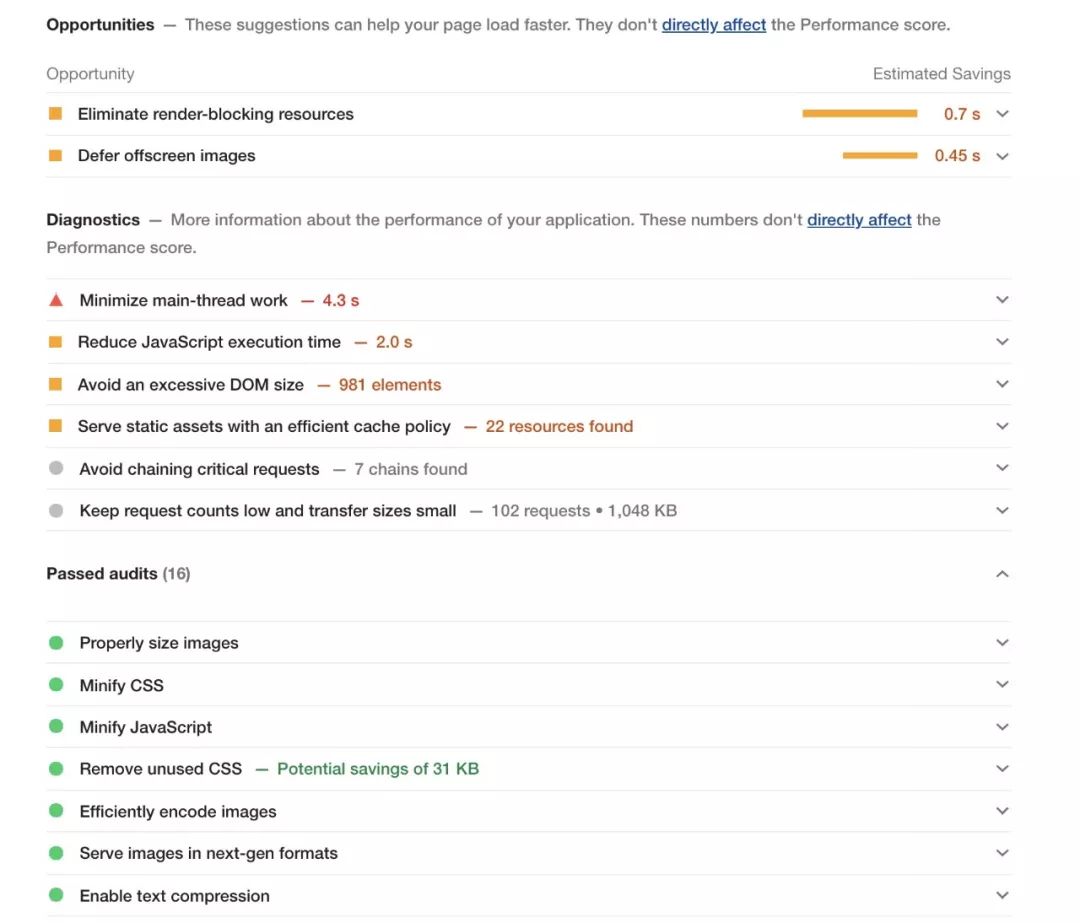这些项目表示LightHouse并不能替你决定当前是好是坏,但是把详情列出来,由你手动排查每个项目的情况