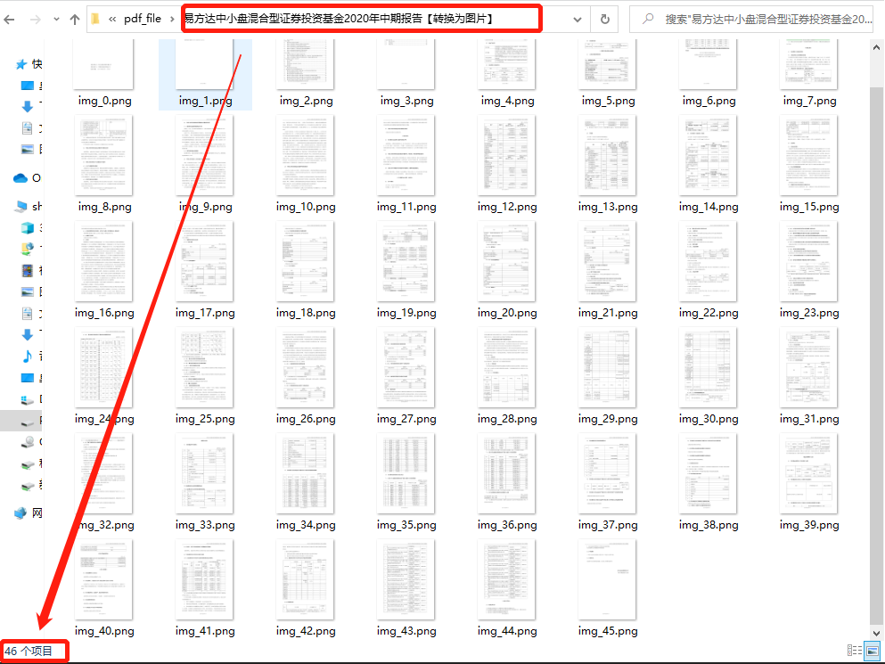 以“易方达中小盘混合型证券投资基金2020年中期报告”为例,整个 PDF 文件一共 46 页,每5页为间隔,最终生成了10个小的 PDF 文件