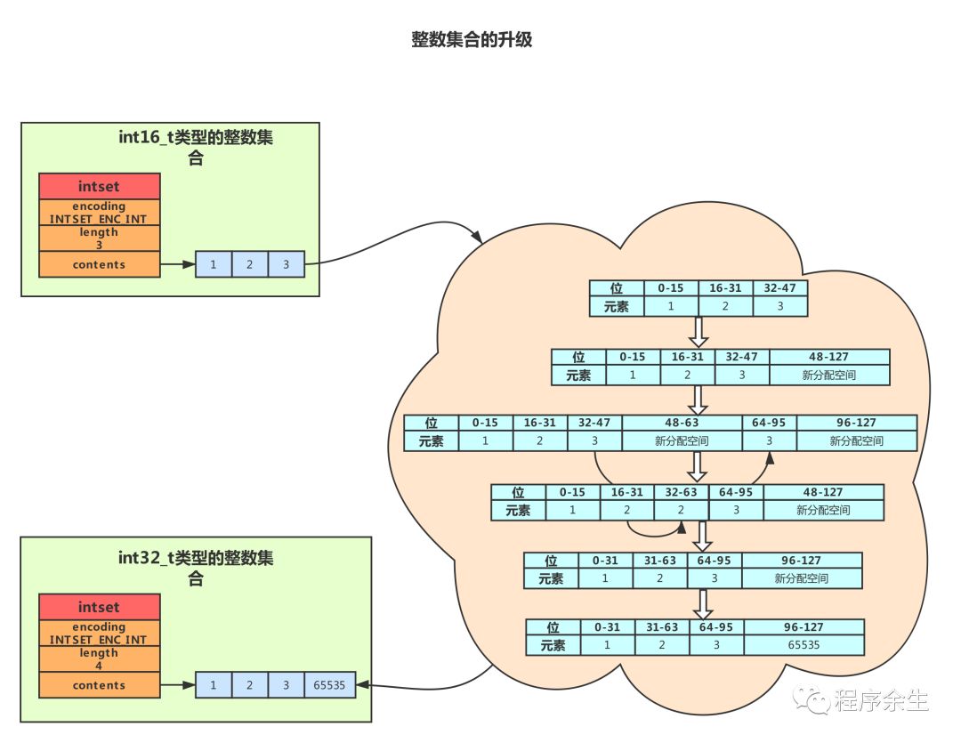 而整数集合现在的做法既可以让集合能同时保存三种不同类型的值,又可以确保升级操作只会在有需要的时候进行,这可以尽量节省内存。如果我们一直只向整数集合添加int16_t类型的值,那么整数集合的底层实现就会一直是int16_t类型的数组,只有在我们要将int32_t类型或者int64_t类型的值添加到集合时,程序才会对数组进行升级。