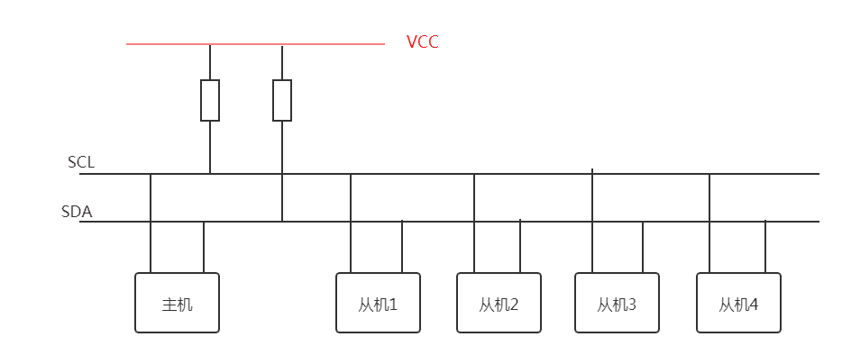 IIC硬件连接主要包括IIIC主机、IIC从机、IC总线及上拉电阻。