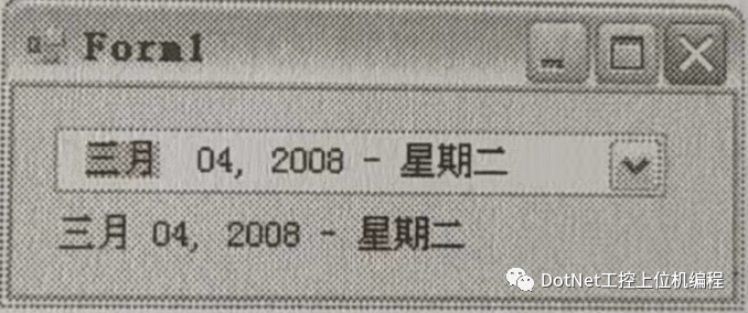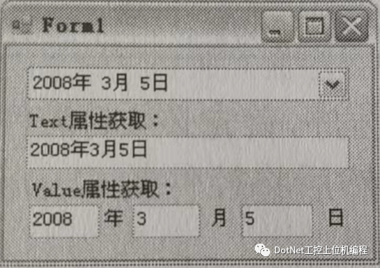 private void Form1_Load(object sender,EventArgs e){//使用控件的 Text 属性获取当前控件选择的日期TextBox1.Text = dateTimePicker1.Text;//使用 Value 属性的 Year 方法获取选择日期的年textBox2.Text = dateTimePicker1.Value.Year.ToString();//使用 Value 属性的 Month 方法获取选择日期的月textBox3.Text = dateTimePicker1.Value.Month.ToString();//使用 Value 属性的 Day 方法获取选择日期的日textBox4.Text = dateTimePicker1.Value.Dey.ToString();}