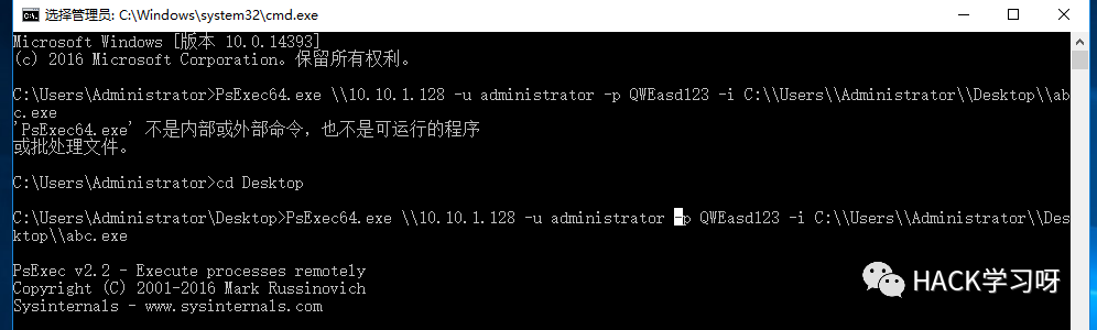 那么这里我们有管理员的帐号跟密码,我们就可以使用到psexec的exe直接执行命令
