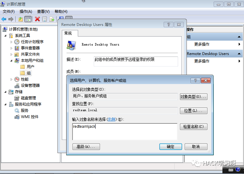 添加redteam\jack到win7的远程桌面组。