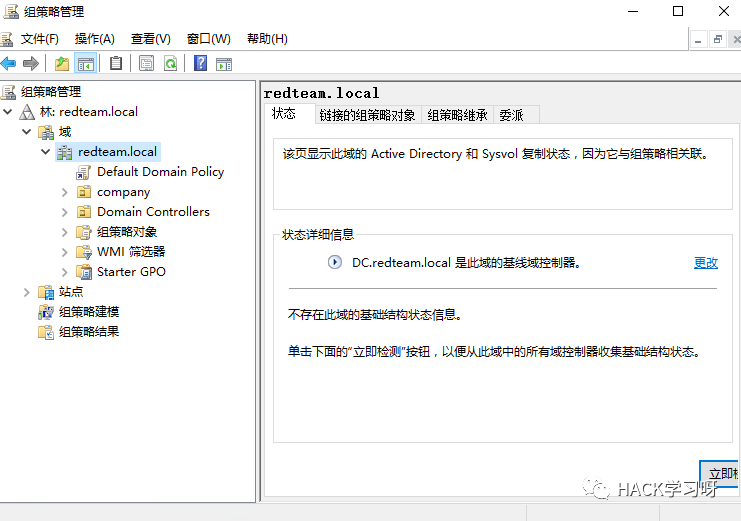 组策略链接:可以看到右边的作用域路径是整个redteam.local也就是说在这个域内的所有计算机,用户都会搜到影响。