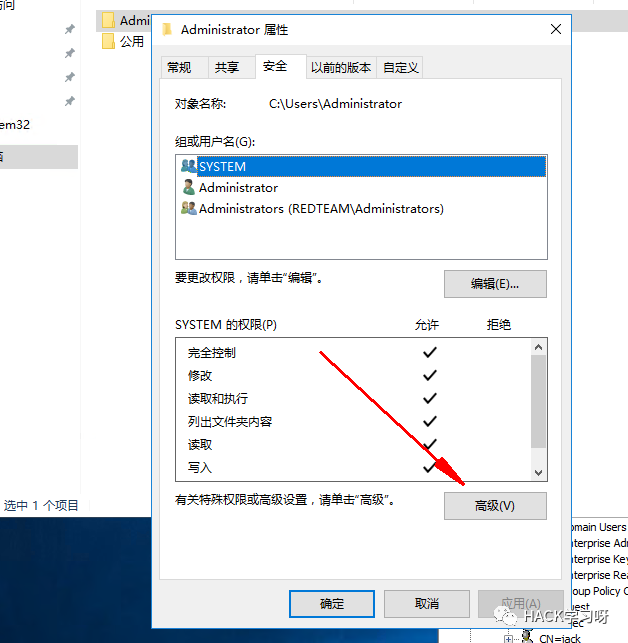 打开高级功能然后点击属性->安全
