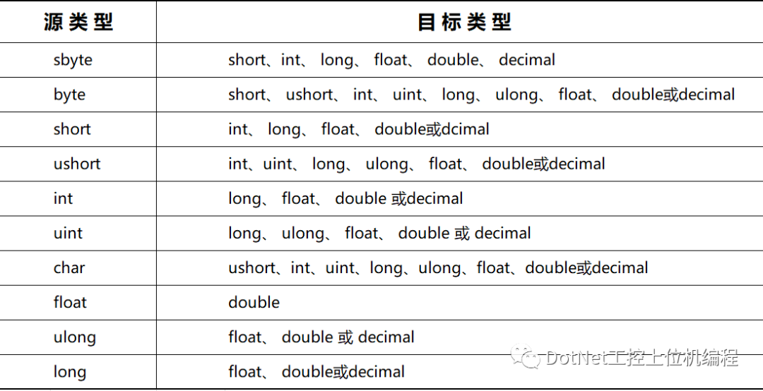 所谓隐式转换就是不需要声明就能进行的转换。进行隐式转换时,编译器不需要进行检查就能安全地进行转换。表 1 列出了可以进行隐式转换的数据类型。