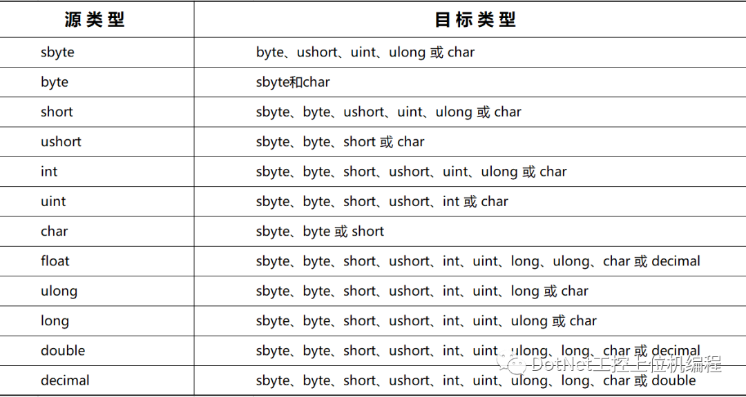 显式转换也可以称为强制转换,需要在代码中明确地声明要转换的类型。如果要在不存在隐式转换的类型之间进行转换,就需要使用显式转换。表 2 列出了需要进行显式转换的数据类型。