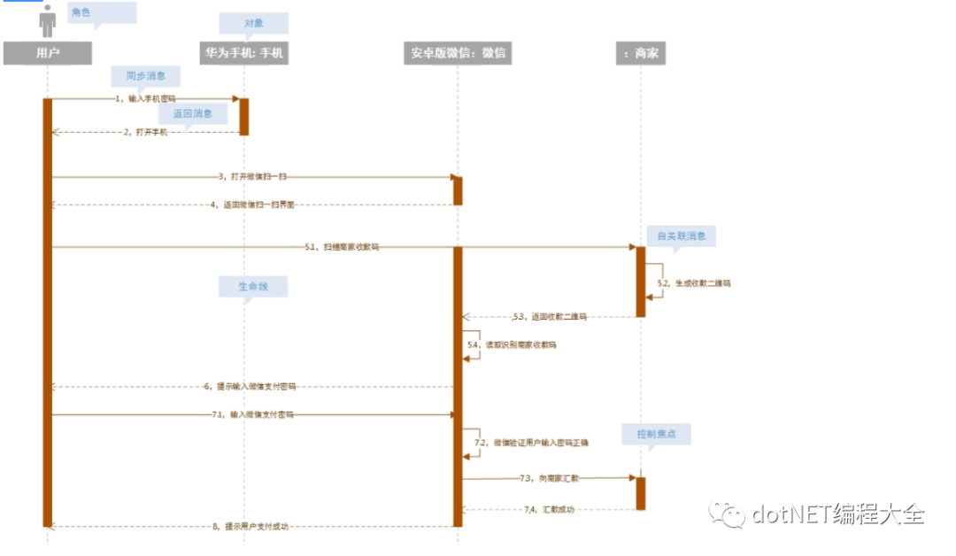 下面我们来使用Visio2016来画一个用户打开微信扫描二维码支付流程时序图,通过这个时序图来认识刚刚介绍的6种时序图元素。
