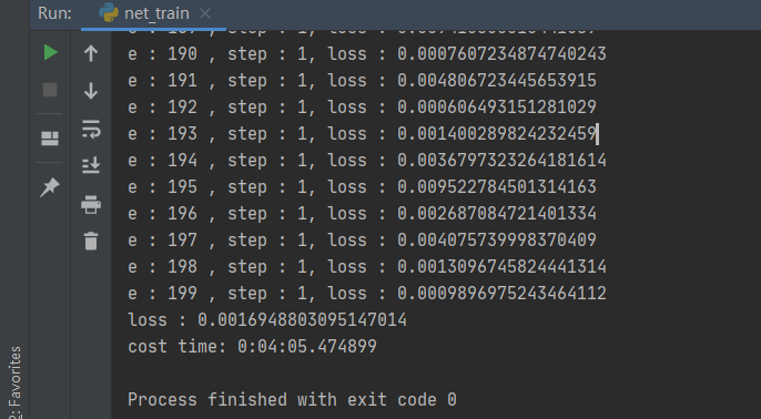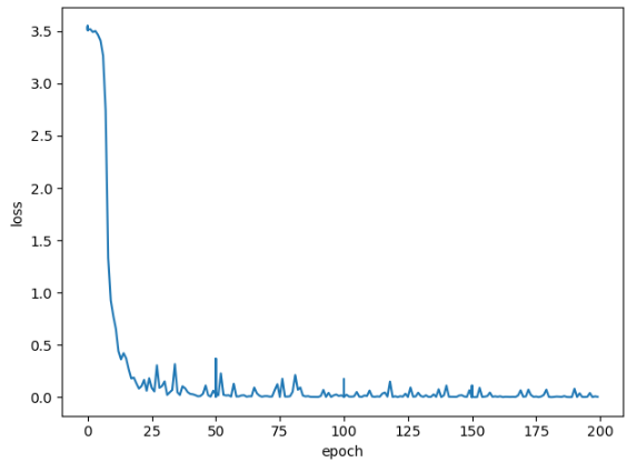 可以看到迭代200次,花费4分钟的训练,模型趋于拟合效果,次数越往后梯度下降越慢。其实在迭代100次之后就接近稳定来回振荡,损失值减少越慢,最后的损失值为0.0016,拟合效果还不错,如果增加训练数据量、迭代次数、优化部分字符串的切割,可以让模型效果更好,读者可自行实践。