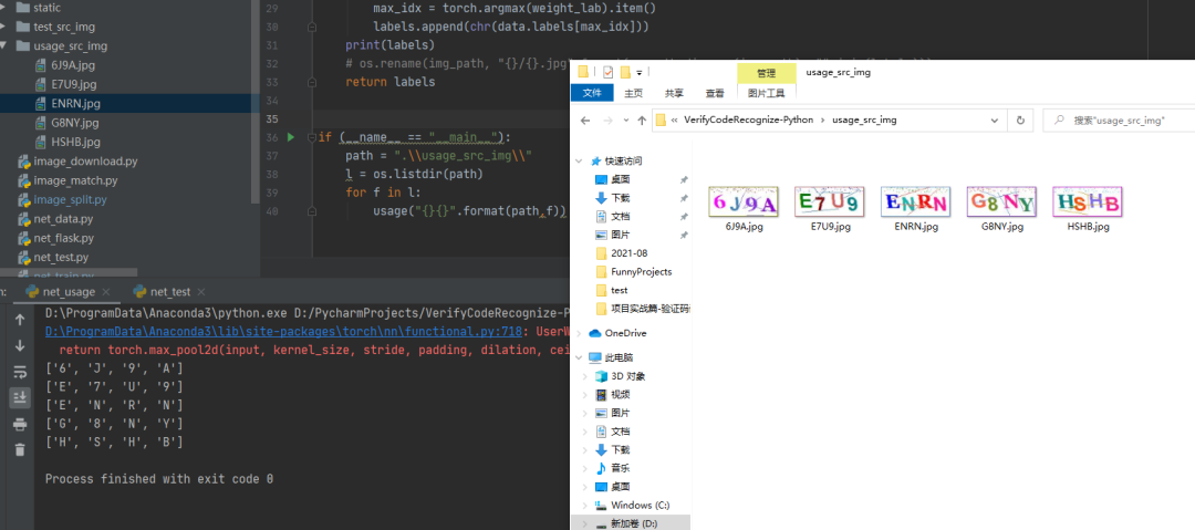 通过实现思路第1-2步,可以得到相关图片验证码字符数据,笔者这里准备训练集500多张(这里得感谢我妹子花时间帮我在标注系统上手动标注的初始数据集~~),测试集30多张,预测5张。读者在python项目拉取下来后,对应的文件夹下面已有全部数据,对应路径如下: