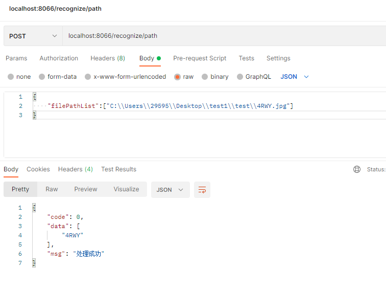 使用python的web框架Flask API,编写图片验证码识别POST接口,传入文件路径,启动web应用,以下是通过本机文件路径识别接口代码,详细代码见net_flask.py