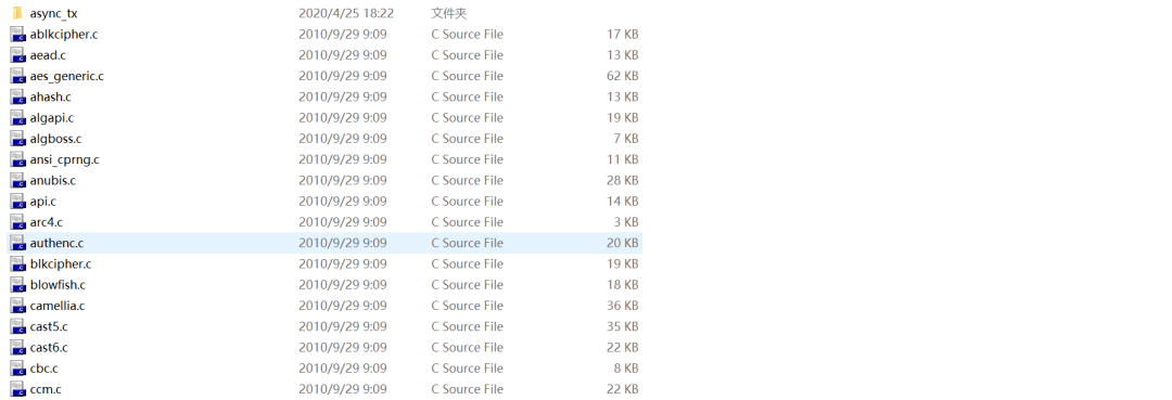 crypto:英文意思是加密。这个目录下放了一些各种常见的加密算法的C语言代码实现。譬如crc32、md5、sha1等