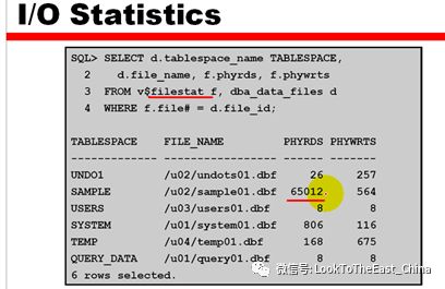 Select d.tablespace_name,d.file_name,f.phyrds,f.phywrts from v$filestat f,dba_data_files d where f.file#=d.file_id;