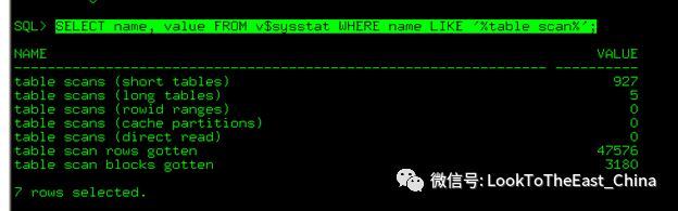 Select name,value from v$sysstat where nane like ‘ %table scan%’
