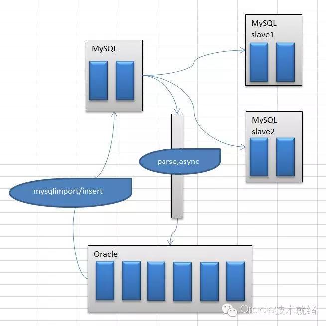 首先还是保持MySQL原有的架构,一个主库,两个备库。因为主库中的binlog是做数据同步的关键,所以可以考虑设置一个路径做sql解析,sql解析还是使用binlog,然后再做适当的变更。这个过程可以是一个异步的过程,然后和Oracle结合起来部署到Oracle中的 schema中。
