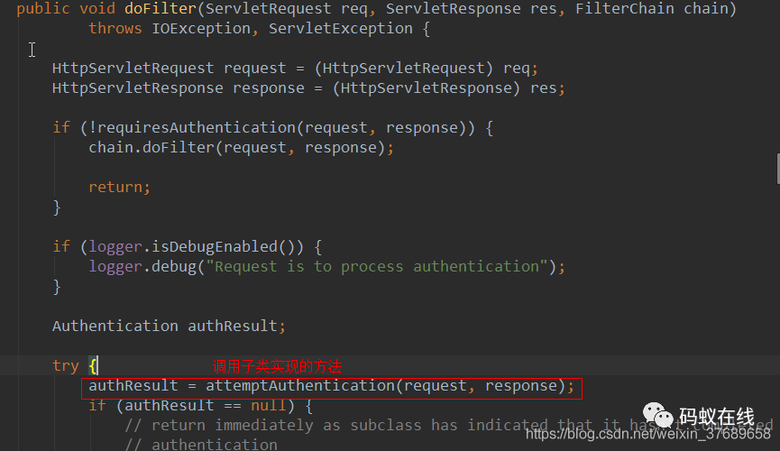 这里已表单提交为例,当我们提交表单时,UsernamePasswordAuthenticationFilter首先会拦截请求,而UsernamePasswordAuthenticationFilter是继承于AbstractAuthenticationProcessingFilter的,在这个抽象类中已经定义好了doFilter的方法,而里面有一个attemptAuthentication方法是由子类实现的。所以当提交表单时spring security会发现这个一个表单提交,然后就调用了UsernamePasswordAuthenticationFilter的doFilter方法