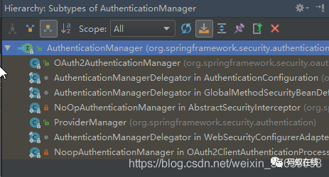 然后我们可以看到首先是创建了一个UsernamePasswordAuthenticationToken对象,把用户名和密码传进去,再调用了getAuthenticationManager().authentication()方法,并把 UsernamePasswordAuthenticationToken对象传进去,那么这个AuthenticationManager是什么尼,其实它是一个接口