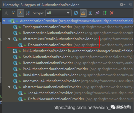 可以看到它的实现类有很多,我们这里主要来看DaoAuthenticationProvider这个实现类,但是在这个类中并没有找到authenticate方法,那么我们来它的父类AbstractUserDetailAuthenticationProvider里面来看下