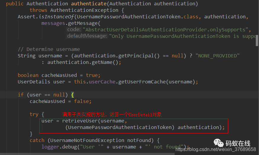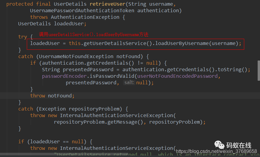 里面拿到我们之前加入到容器中的userDetailService然后调用loadUserByUsername方法拿到我们包含数据库用户信息的UserDetail对象,并且捕获用户名找不到等异常,所以这个方法就是来获取我们之前定义的userDetailService返回的UserDetail。
