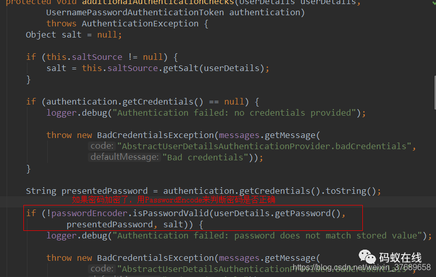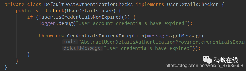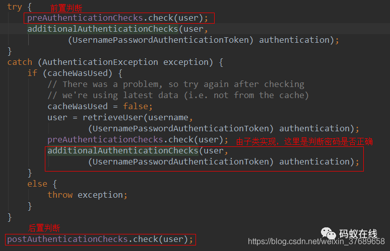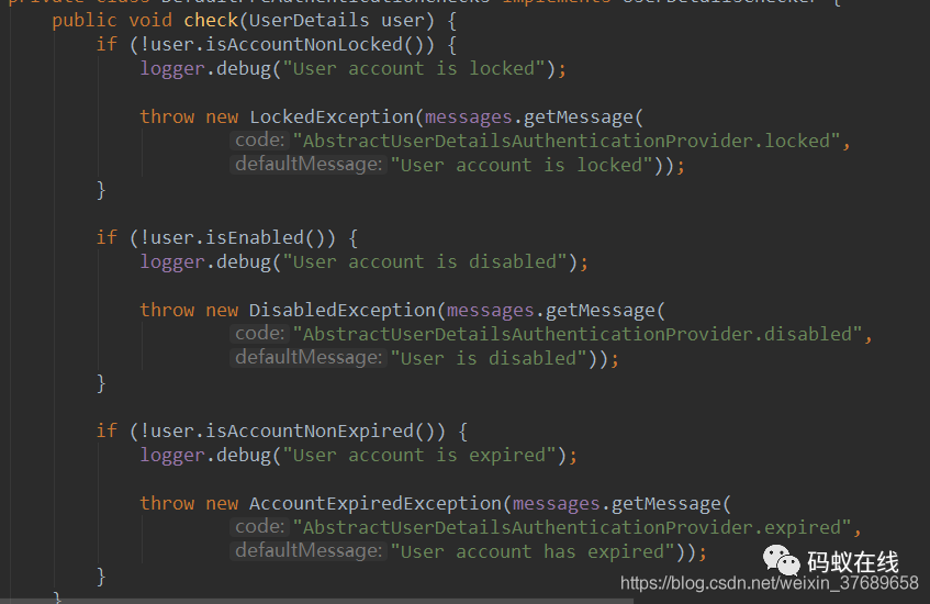 里面就是调用了UserDetail对象一些实现方法进行判断,比如说账户是否锁定,账户是否能用,账户是否过期的判断,判断通过后来到了密码判断
