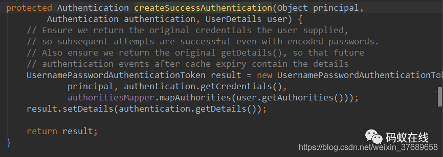 判断都没问题之后,最后返回了一个authentication对象,这里把用户名,密码,权限都传到UsernamePasswordAuthenticationToken中去,因为所有判断都没问题,这些信息都是正确的了。