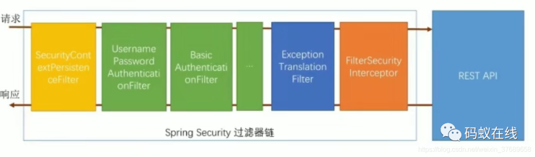 我们可以看到在spring security内部其实是通过一个过滤器链来实现认证流程的,比如说这里的UsernamePasswordAuthenticationFilter就是拦截我们通过表单提交接口提交的用户名和密码,如果是Basic提交的话,就会被BasicAuthenticationFilter拦截,最后的橙色FilterSecurityInterceptor是首先判断我们当前请求的url是否需要认证,如果需要认证,那么就看当前请求是否已经认证,是的话就放行到我们要访问的接口,否则重定向到认证页面。