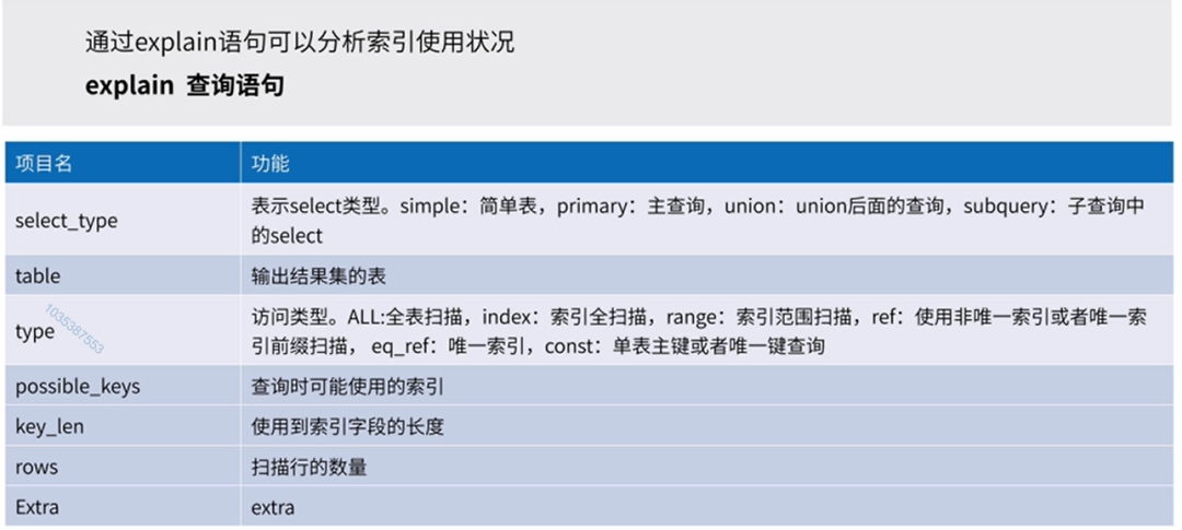 explain索引分析:分析表的读取顺序;数据读取操作的操作类型;哪些索引可以使用;哪些索引被实际使用;表之间的引用;每张表有多少行被优化器查询。