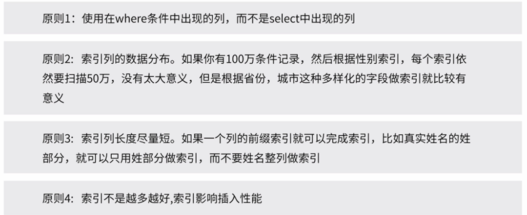 索引实战经验:1、选择区分度高的列建立索引2、每次查询每张表仅能使用一个索引;3、避免对索引列进行计算。