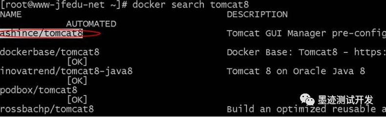 5)在Docker官方仓库中搜索Tomcat镜像文件,镜像文件中包含Tomcat软件程序,操作的方法和指令如下: