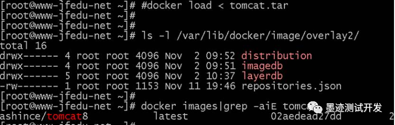 7)查看已下载Tomcat镜像文件的存储路径和镜像列表信息,操作的方法和指令如下:
