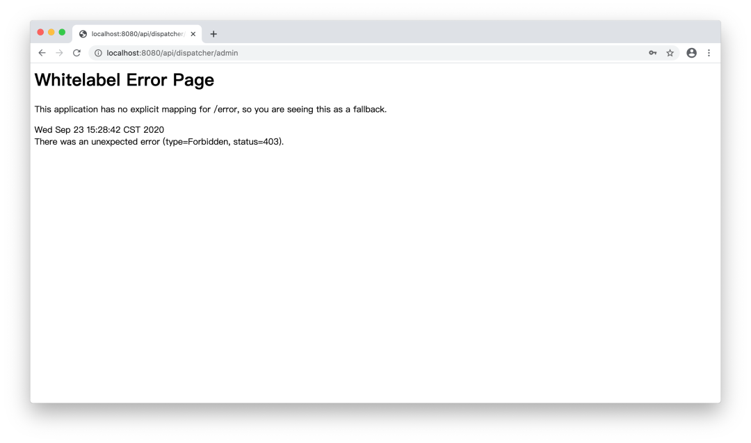 在浏览器中输入http://localhost:8080/api/dispatcher/admin,首先使用user/password登录,系统返回403错误(user用户不具有ADMIN角色):