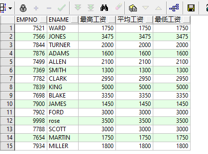 MAX(sal) "最高工资",AVG(sal) "平均工资",MIN(sal) "最低工资"