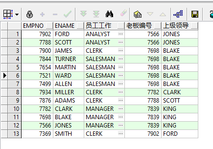 SELECT e.empno,e.ename,e.job "员工工作",e2.empno AS "老板编号" ,e2.ename "上级领导"