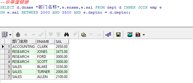ON e.sal BETWEEN 2000 AND 3500 AND e.deptno = d.deptno;