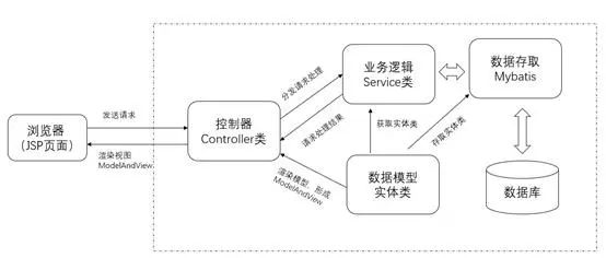 上图是在实际开发中MVC的架构图,架构图分为两部分:虚线框外的是WEB程序的浏览器部分,用户通过浏览器与系统进行交互,同时浏览器负责解析JSP页面;虚线框内的是WEB程序的后台部分,这部分包括控制(Controller类)、业务逻辑(Service类)、数据模型(实体类)、数据持久层(Mybatis框架)和MySQL数据库管理系统。