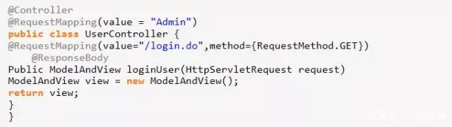 Controller类是在普通Java类的头部加入@Controller注解,使其变为Controller类,在Controller类中使用@RequestMapping注解标记在Controller类方法的头部,使该方法可以响应一个WEB请求地址,当JSP页面向这个地址发送请求时,该方法会被调用。下面的代码是Controller类的样例。