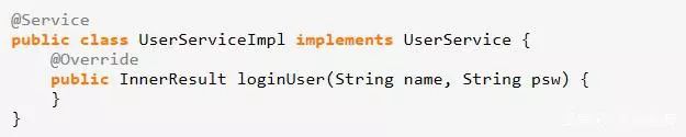 Service类为业务逻辑处理类,在类的头部使用注解@Service标注,被注解@Service标注的类会被Spring框架自动注入到Controller类。下面的代码是Service类的样例。