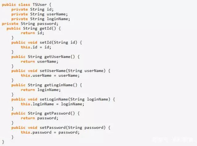 实体类也是POJO类,也就是MVC的数据模型,实体类仅有属性以及获取和设置属性的get和set方法,没有事务处理方法。下面的代码是实体类的样例。