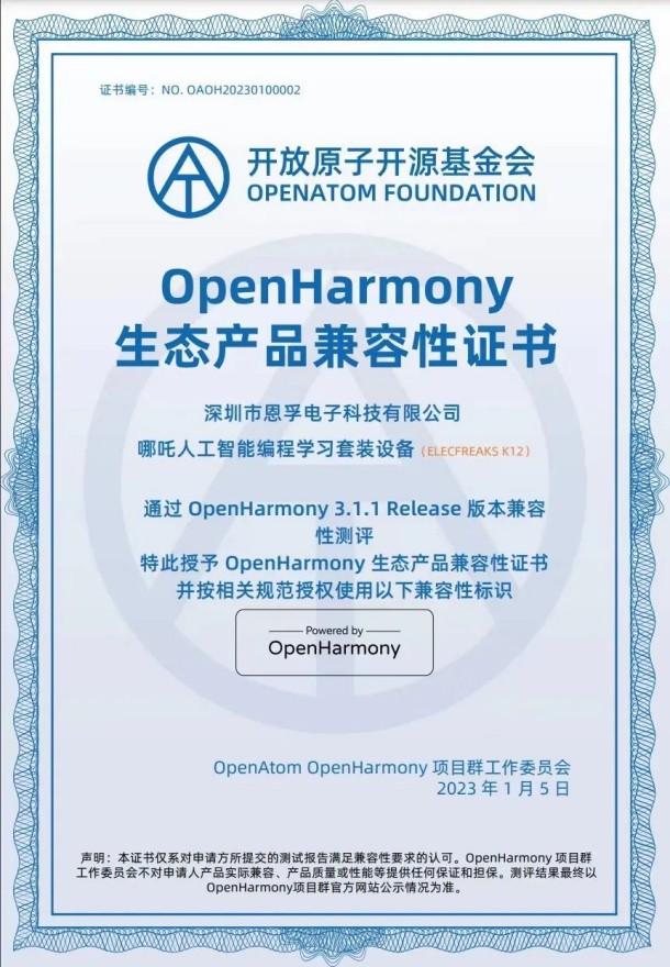 2023年初,基于开源大师兄项目(待更名),由江苏润开鸿数字科技有限公司(以下简称“润开鸿”)提供技术支持的恩孚科技大师兄人工智能编程学习套装——哪吒成功通过OpenAtom OpenHarmony (以下简称“OpenHarmony”)3.1.1 Release版本兼容性测评,作为开源大师兄项目(待更名)硬件生态功能外设产品,其成功获颁OpenHarmony生态产品兼容性证书具有里程碑式的意义。