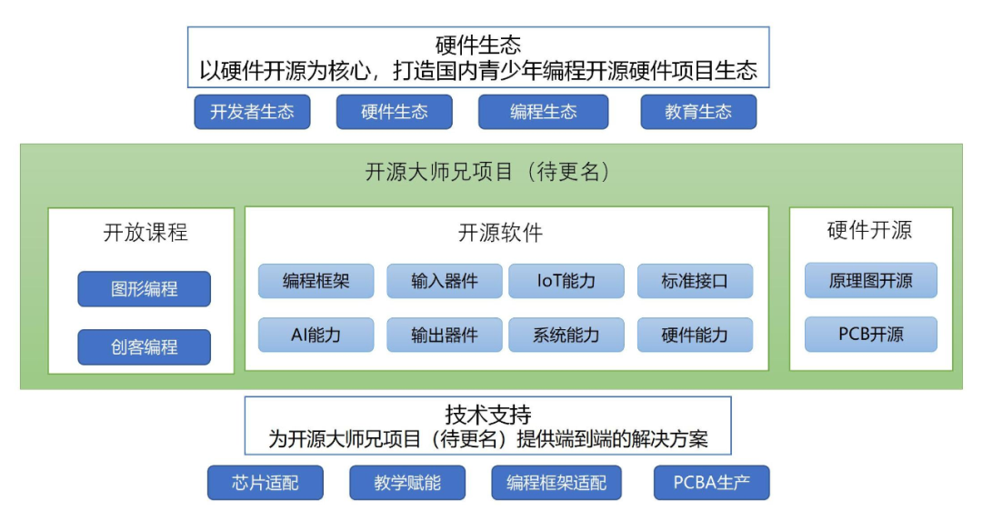 开源大师兄项目(待更名)作为开放原子开源基金会硬件开源项目,秉承“硬件开源、软件开源、课程开放”的宗旨,为青少年图形化、Python代码编程提供软硬件能力支持。开源是开源大师兄项目(待更名)的核心价值,开放共建是特色之一,切实服务于中小学信息科技教育一线需求。硬件侧以开源的硬件、原理图支撑开发者及生态企业设计更多场景化设备,并鼓励其贡献自己的设备原理图、PCB以反哺项目;软件侧在框架层提供统一接口、交互接口、传感器外设、云接入等能力,屏蔽了系统差异,为编程框架层提供一致的能力。