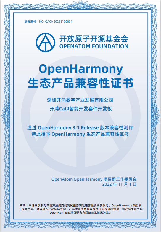 近日,深开鸿Cat4智能开发套件通过OpenAtom OpenHarmony(以下简称“OpenHarmony”)兼容性测评,并获得OpenHarmony 生态产品兼容性证书,标志着深开鸿在OpenHarmony领域的研发能力和创新水平又上新台阶,并为OpenHarmony生态繁荣再添一份力量。
