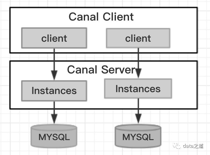 server可以启动多个instance,一个instance负责和一个mysql交互,instance表现为mysql slave实例,接收client请求(subcripition\get\ack),并负责维护元数据(比如当前消费到的binglog file、binlog offset);一个canal client实例只能连接到一个instance: