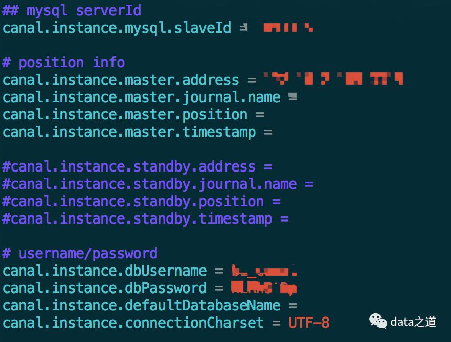 2、实例级配置$CANAL_HOME/conf/$INSTANCE/instance.properties:配置mysql的slaveId、mysql master信息、认证用户名/密码等