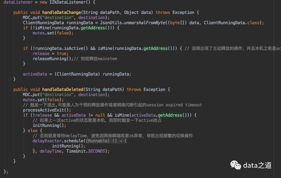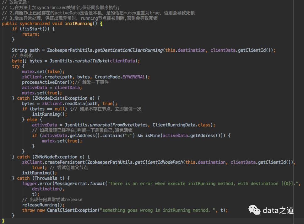 1、ZkClient订阅监听/otter/canal/destinations/{destination}/10001/running节点,这个节点内有当前运行的client信息。当监控到节点数据变化或删除时,会重新在zk上创建running节点: