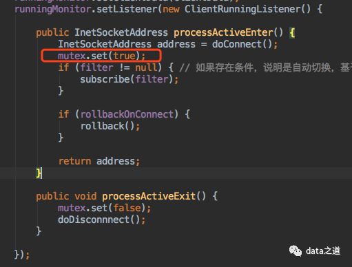 connector进行subscribe、unsubscribe、getWithoutAck、ack、rollback等操作时都有前置判断:进行锁状态判断,这个锁是阻塞锁,只有值是true时才继续操作,false会阻塞操作