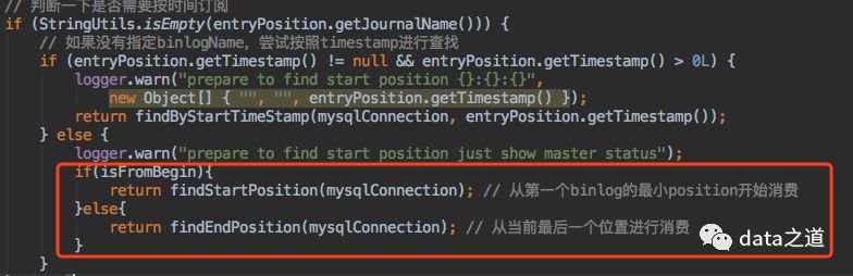 但有的场景需要从最早的binlog消费,这要求先手动查mysql最早binlog文件,然后再在instance.properties配置文件里设置“起始binlog文件”参数值,其过程还是比较繁琐,解决方案是在instance配置文件增加canal.instance.fromBegin参数,修改的核心代码: