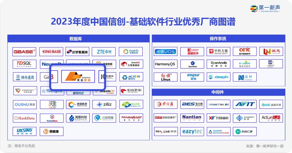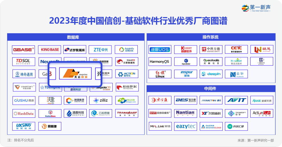 近年来,在国际环境变化、国内数字经济高速发展等多重因素推动下,信创产业进入爆发阶段。依托国家相关政策支持,国内一批芯片、操作系统、数据库、信息安全、办公软件厂商迎来了发展机遇期,自主创新的技术实力和竞争力得到显著提升,营收和利润也均实现快速增长。因此,第一新声研究部通过对信创-基础软件市场进行调研后正式发布《2023年度中国信创-基础软件行业优秀厂商图谱》,天云数据作为自研基础软件厂商成功入选。