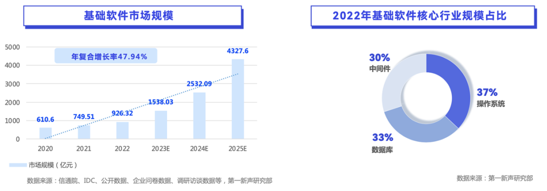 根据第一新声调研分析,2023年基础软件市场规模预计为1538.03亿元,到2025年将达到4327.6亿元,2020年-2025年复合增长率为47.94%。未来几年将是“大信创”发展的关键时期,行业发展空间广阔。信创产业已经从 “试点实践期”进入到“规模化推广期”的关键阶段,与此同时,随着“数字中国”建设规划的推进,信创产业需求正在全面打开,市场订单正在井喷式增长,产业规模正快速增长,产业红利预计将会持续到2027年前后。